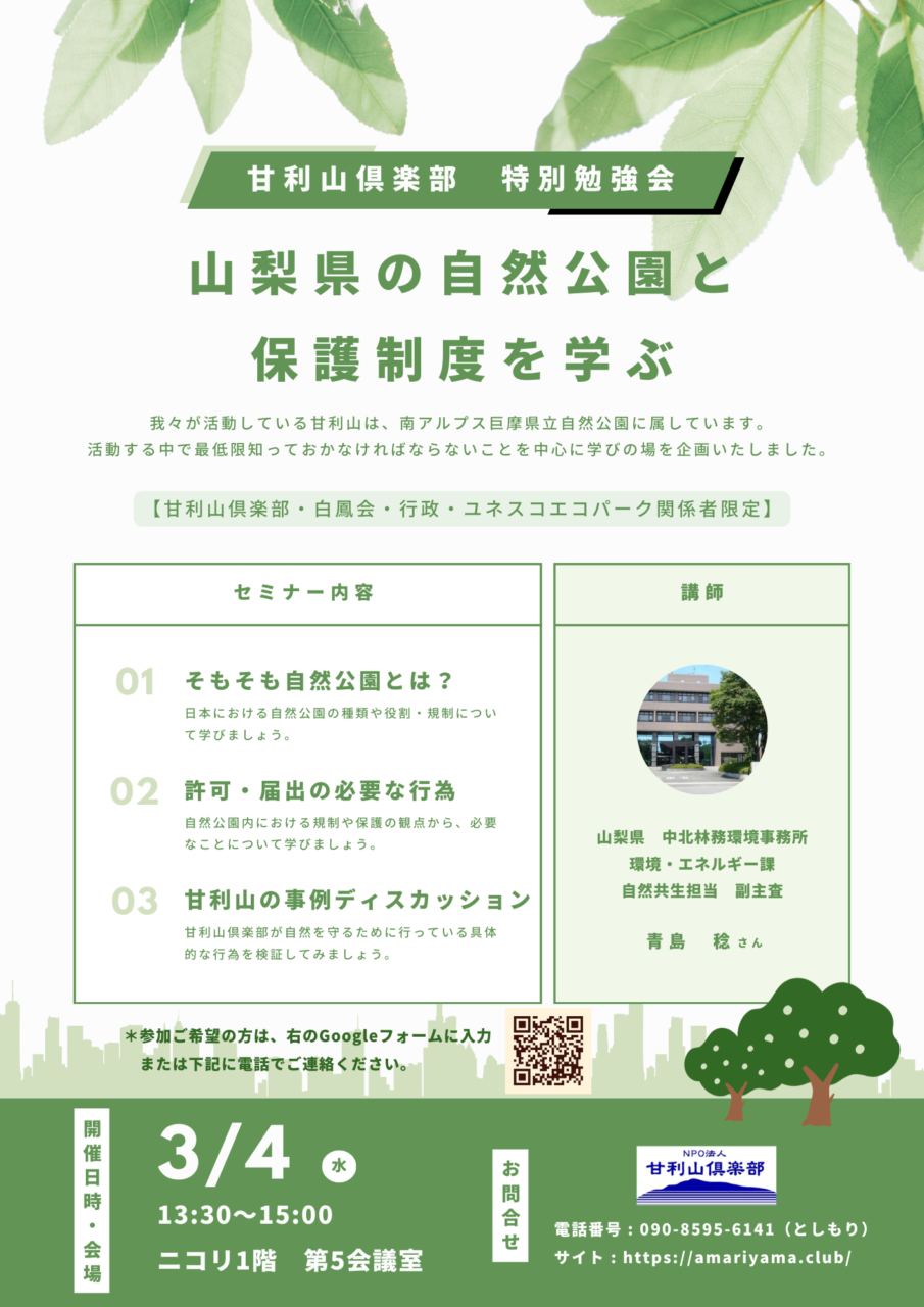 我々が活動している甘利山は、南アルプス巨摩県立自然公園に属しています。今回は、自然公園法についてメンバー・関係者の認識を深めるための限定企画となります。