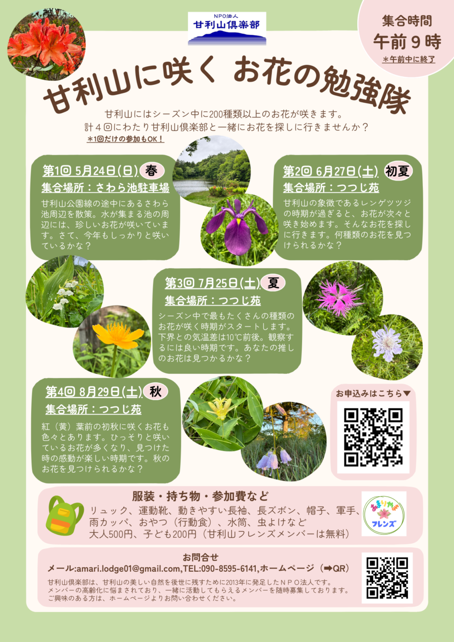 - お問合せ NPO法人甘利山俱楽部 TEL:0551-22-6682、✉amari.lodge01@gmail.com